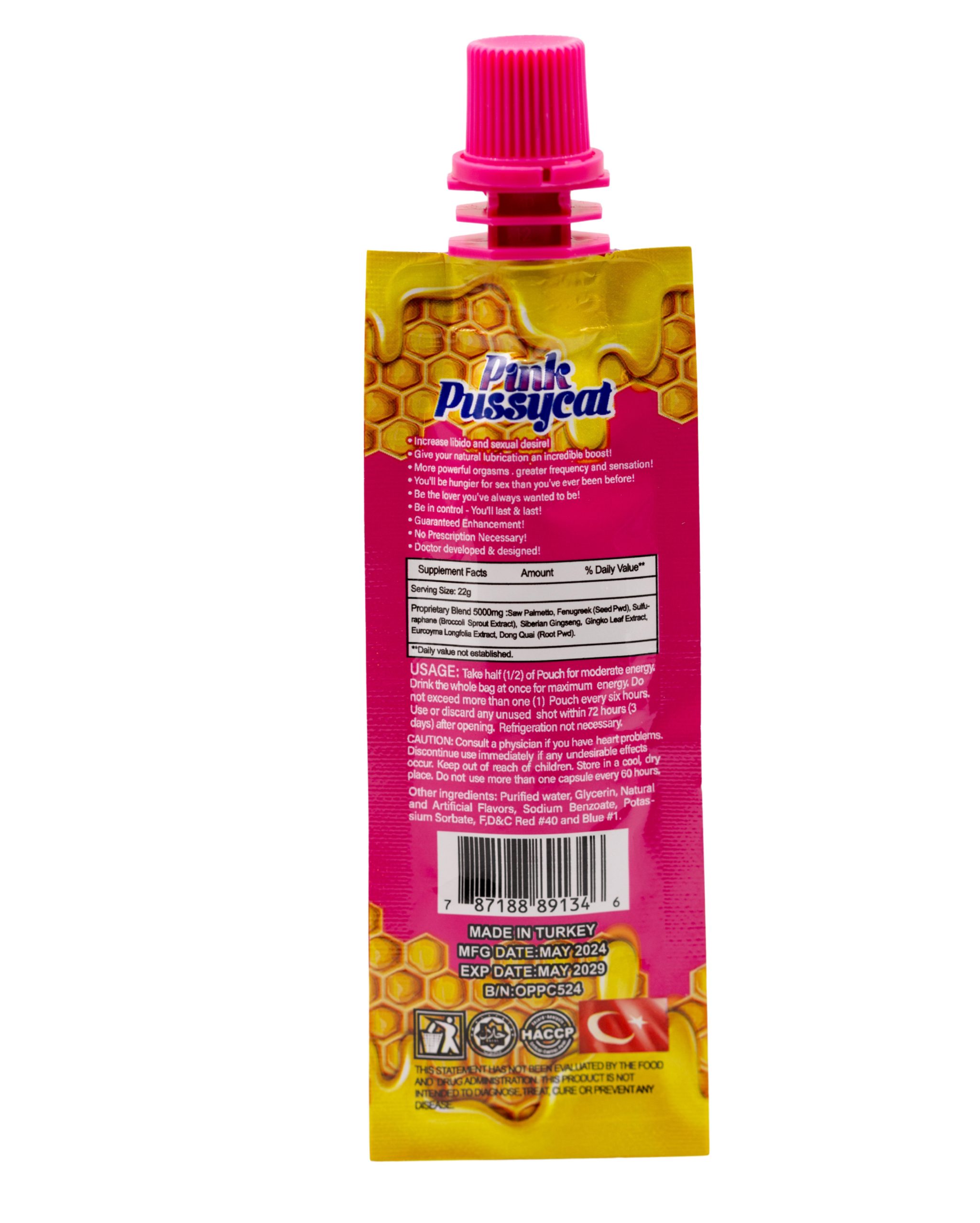 Pink Pussycat Honey is a fast-acting sexual enhancement supplement designed specifically for women. Infused with natural ingredients and genuine honey, each single-serving packet delivers a sweet, sensual boost that not only tastes amazing but also works quickly to: